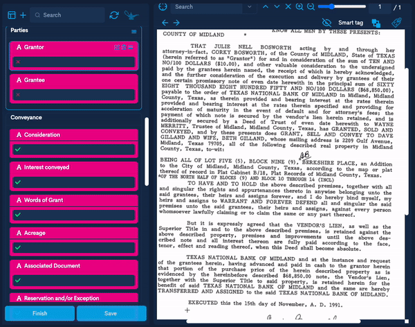 According to Wikipedia, optical character recognition (OCR) is the electronic or mechanical conversion of images of typed, handwritten or printed text into machine-encoded text, whether from a scanned document or a photo of a document. Gone are the days of having a document up on one screen and your runsheet on another, slowly going thru and typing out the pertinent details. All documents within our courthouse system are OCRed for your convenience so that you can quickly extract out the details you need. Soon, many details will be pre-annotated so that when you add a document to your runsheet the details you need are already filled out for you. This allows you to spend your time reviewing documents rather than typing details into an excel spreadsheet.